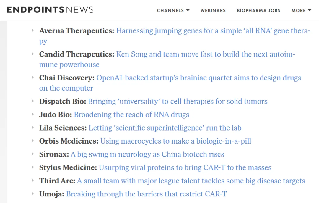 2024年9月19日,全球知名的生物医药媒体Endpoints News发布了“The Endpoints 11 list:the most exciting biotech startups of 2025”,该榜单主要授予2025年生物技术领域最具前景的年轻初创公司。