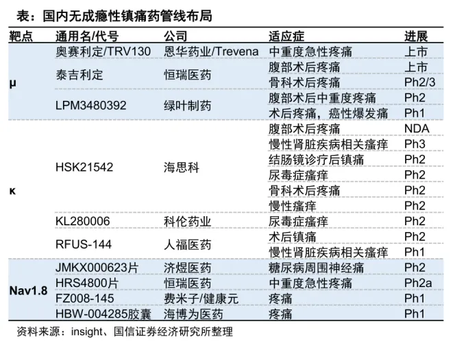 恒瑞医药也杀入这一赛道,其 1 类新药富马酸泰吉利定(SHR8554)已斩获两项适应症,包括用于腹部手术后中重度疼痛、骨科术后镇痛。