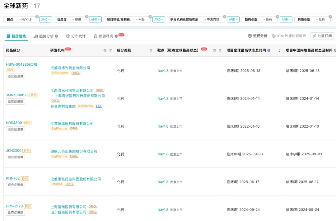 Insight 数据库显示,全球有超 30 款靶向 NaV1.8 的在研新药(仅统计活跃状态)正在开发针对疼痛的研究。在中国市场,已进入临床阶段的 NaV1.8 抑制剂,包括恒瑞医药的 HRS4800 和 HRS-2129、济民可信的 JMKX000623、健康元的 FZ008-145 胶囊和 JKN2306 片、康弘药业 KHN702、海博为药业 HBW-004285 等。