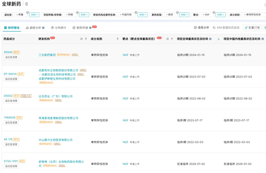 目前,已进入临床阶段的 NGF 单抗,包括三生制药 SSS40(I/II 期)、苑东生物 EP-9001A(I/II 期)、康方生物 AK 115(I 期)、达石药业的超长效无成瘾镇痛药 DS002。其中,DS002 已完成Ⅱ期研究,研发进度领先全球同类药物,有望成为全球首款用于癌痛治疗的非阿片类强效镇痛药。
