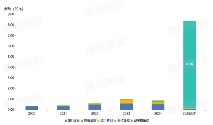 肥胖症治疗药物国内院端放大市场金额(2020-2025Q1)