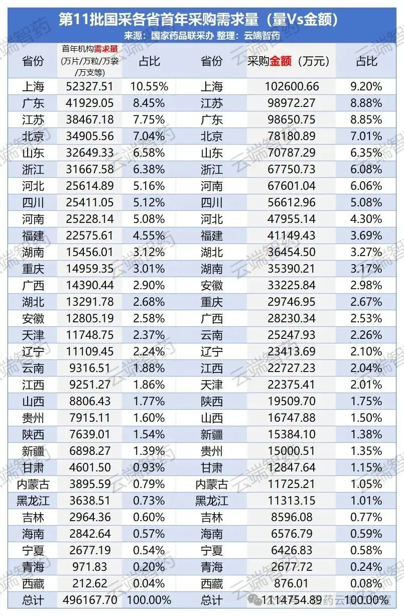 第11批国采已拉开序幕,透过各省首年采购需求量,可以洞察各地用药及报量整体情况,以便在10月21日开标后次日进行供应省区选择时作为参考依据。