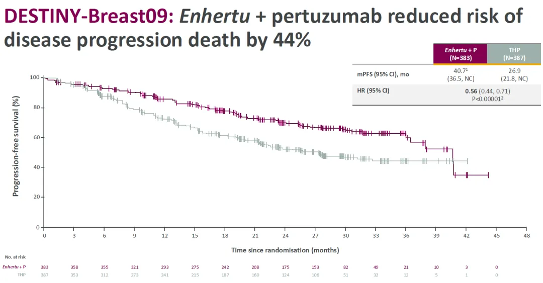 相比于 THP(紫杉醇+曲妥珠单抗+帕妥珠单抗)对照组,Enhertu+帕妥珠单抗治疗组的 mPFS 从 26.9 个月延长到 40.7 个月,将疾病进展或死亡风险降低 44%。