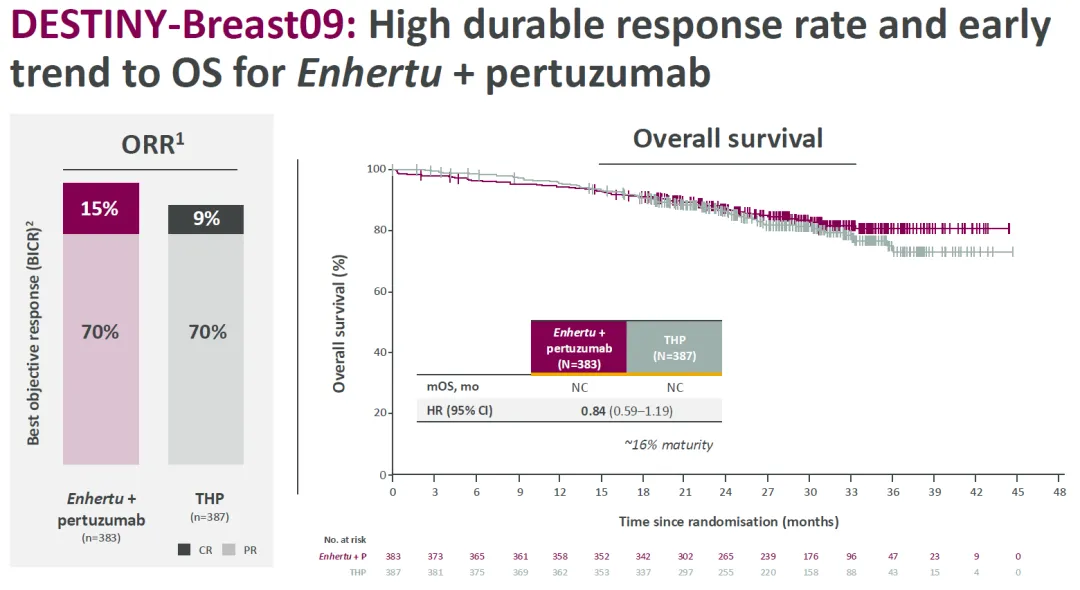 Enhertu+帕妥珠单抗治疗组和 THP 对照组的 ORR 分别为 85%、79%,mOS 均为达到,死亡风险降低 16%。