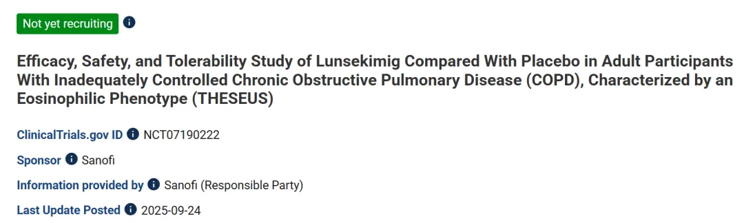 9月24日,全球临床试验收录网站显示,赛诺菲的TSLP/IL-13双抗Lunsekimig(SAR443765)推进至II/III期阶段,针对慢性阻塞性肺病(COPD)启动了两项II/III期临床试验(THESEUS和PERSEPHONE)。