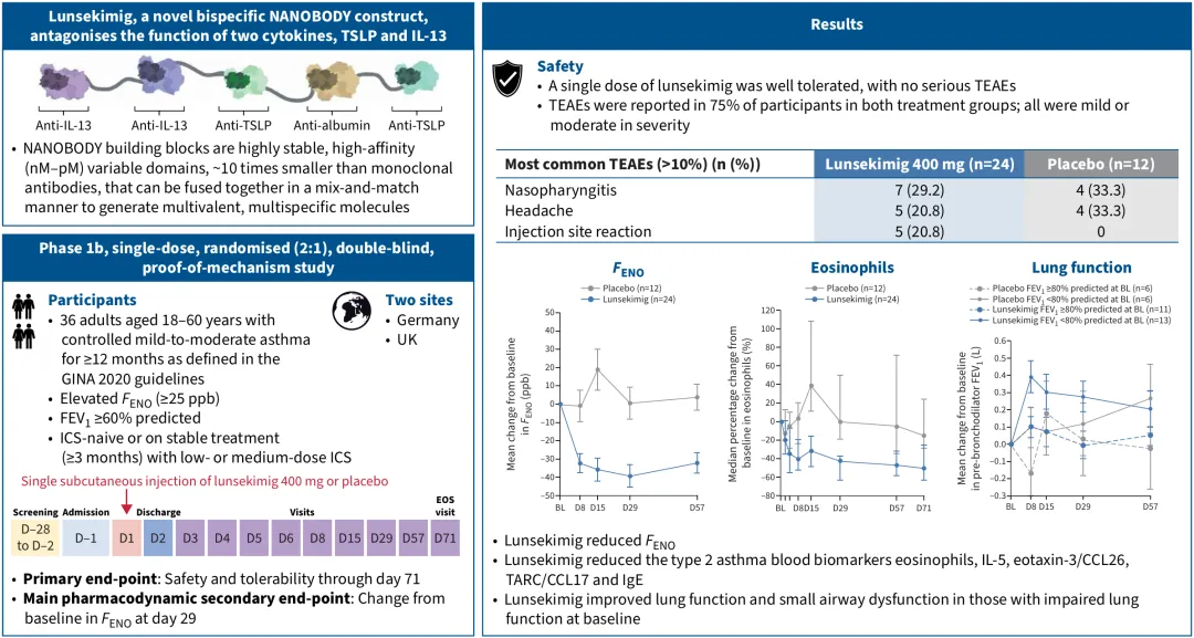 此前,赛诺菲曾公布Lunsekimig治疗哮喘的Ib期概念验证研究数据。数据显示,哮喘患者经400mg Lunsekimig治疗28天后,呼出一氧化碳分数(FENO)较基线显著降低,较安慰剂组降幅为40.9ppb(p<0.0001)。此外,患者的2型炎症反应生物标志物水平亦显著降低。