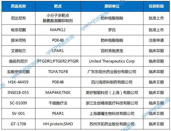 除了以上已进入临床后期的项目,还有更多新药正在致力于“攻克”IPF这一严重疾病,其中不少产品来自国内药企。