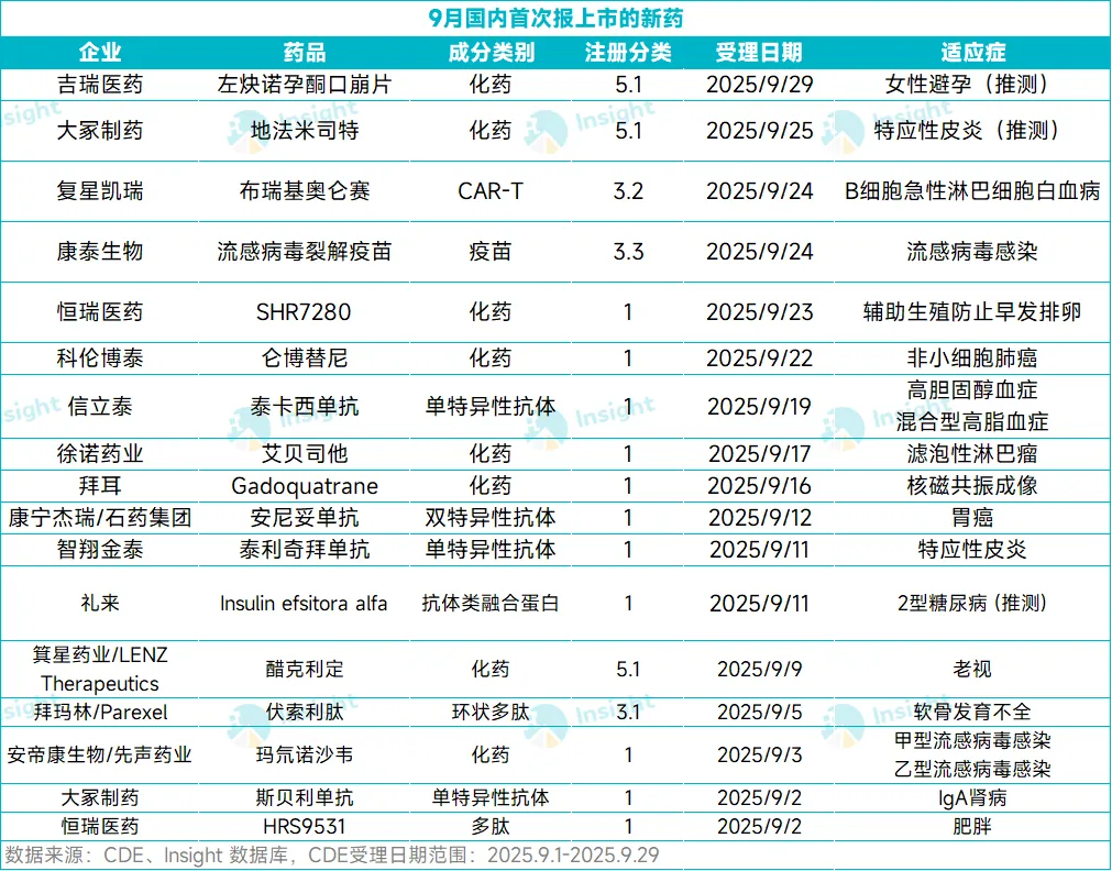 根据 Insight 数据库,截至 9 月 29 日,共计有 31 款新药在本月向 NMPA 递交了上市申请(含新适应症,不含原研地产化品种),数量为今年单月第 2 高。其中,国产药有 14 款,进口药有 17 款。药物类型上,化药有 14 款,生物药有 17 款。