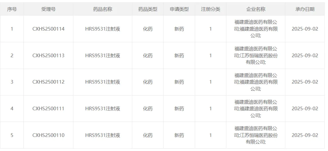 9 月 2 日,恒瑞医药的 HRS9531 注射液上市申请获得受理,适应症为在控制饮食和增加运动的基础上用于成人的长期体重管理,患者的初始体重指数(BMI)需≥28 kg/m2(肥胖)或≥24 kg/m2(超重),并伴有至少一种体重相关合并症。