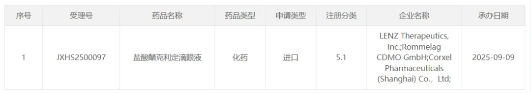9 月 9 日,箕星药业和 LENZ Therapeutics 联合递交的盐酸醋克利定滴眼液上市申请获得受理,适应症为老视(俗称老花眼)。