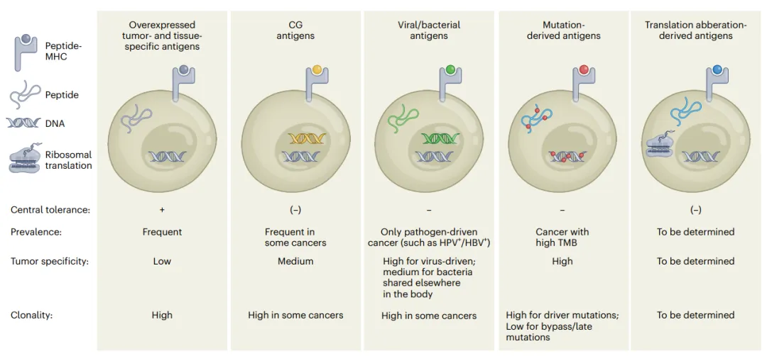 确定这些特征的最佳组合非常重要。例如,突变衍生的新抗原具有很好的免疫原性,但往往是个性化的,而自身抗原广泛适用,但免疫原性较低。目前积累的临床经验为了解自身抗原和突变衍生的新抗原的适用性提供了宝贵的见解,以下四个主要参数囊括了有助于抗原治疗效果的各种特性:包括每个抗原类别在患者群体中的流行率、每个类别对肿瘤细胞而非体细胞的特异性、不同抗原的免疫原性和克隆性。