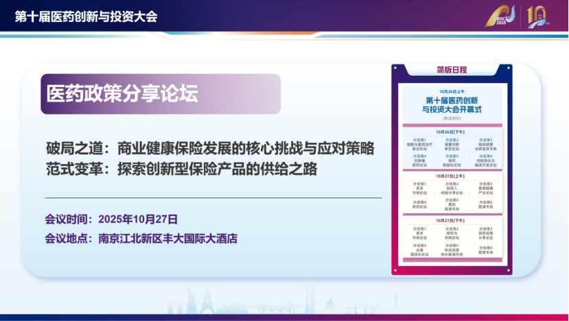跨越山海,未来已来。为破解医药创新产业商业化“最后一公里”难题第十届医药创新投资大会-医药政策分论坛将重磅启幕,汇聚保险机构、药企代表、医疗机构及学界领袖,围绕基本医保与商保协同之道、商业健康险参与多元支付机制的路径、商保创新药目录的实践与展望等核心议题展开深入探讨,凝聚多方合力,为我国医药创新产业高质量发展注入新动能。