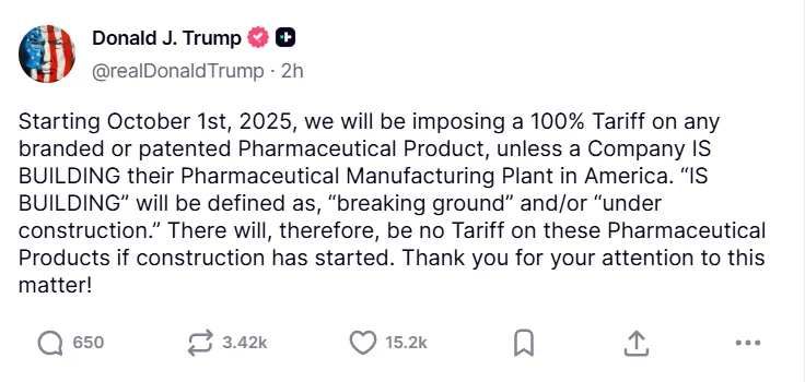 与此同时,特朗普还在 “真相社交”(Truth Social)平台中,补充了一项关键豁免条款:该措施不适用于在美国建设药品生产工厂的企业,包括已破土动工或正在施工的场地。因此,若(药品生产工厂)已启动建设,其生产的药品产品将不被征收关税。