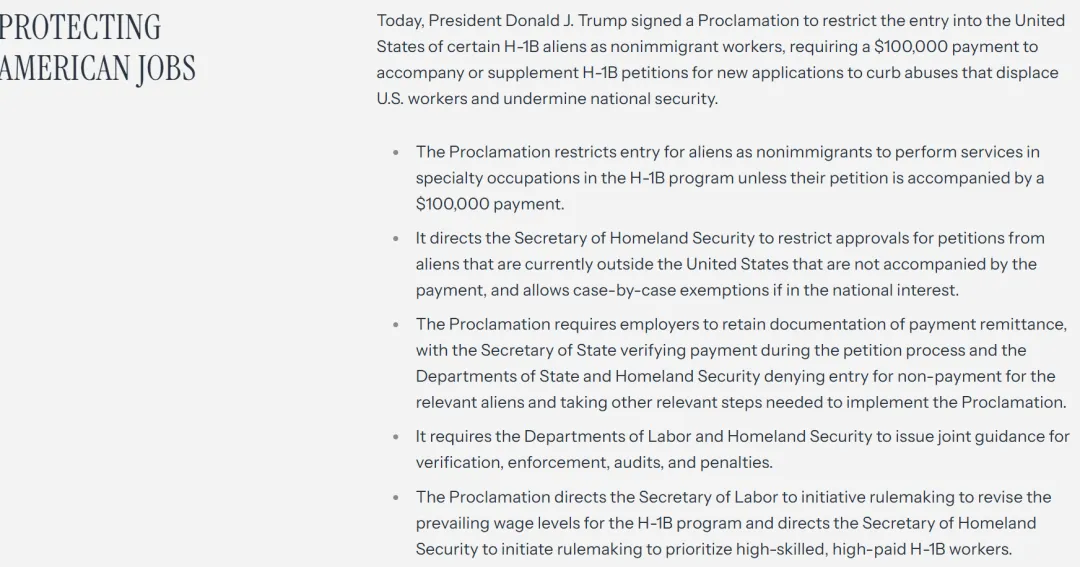 颇为戏剧性的是,就在几天前,特朗普签署行政令,大幅改革H-1B签证项目,要求雇主为每位H-1B签证申请人缴纳10万美元费用,新规于9月21日凌晨生效,否则不得入境。H-1B签证长期以来是美国吸引全球人才的重要途径,在科技、工程、生物医药等领域发挥着关键作用。新政一出意味着在美雇佣外籍员工成本提高近百倍。