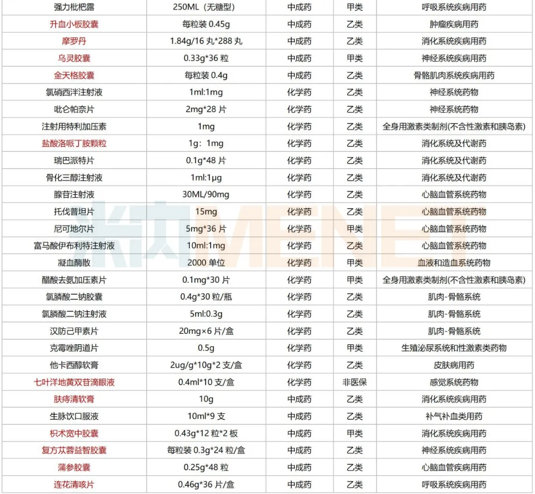 61个普通药品(以药品名称计)中,有39个化学药、17个中成药、5个治疗用生物制品;从治疗大类看,以消化系统及代谢药、心脑血管系统药物、神经系统药物、肌肉-骨骼系统药物为主。