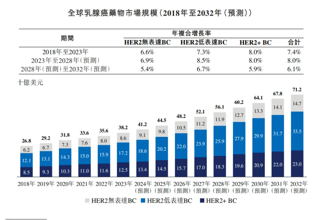 乳腺癌,大家并不陌生。2023年全球癌症发病率排名,乳腺癌排第二,2023年美国癌症发病率排名,乳腺癌排第一。如图所示,全球乳腺癌市场规模2023年达到了382亿美元,其中美国市场达到了172亿美元;而预期2032年全球乳腺癌市场规模将达到712亿美元,预期美国市场将达到335亿美元。