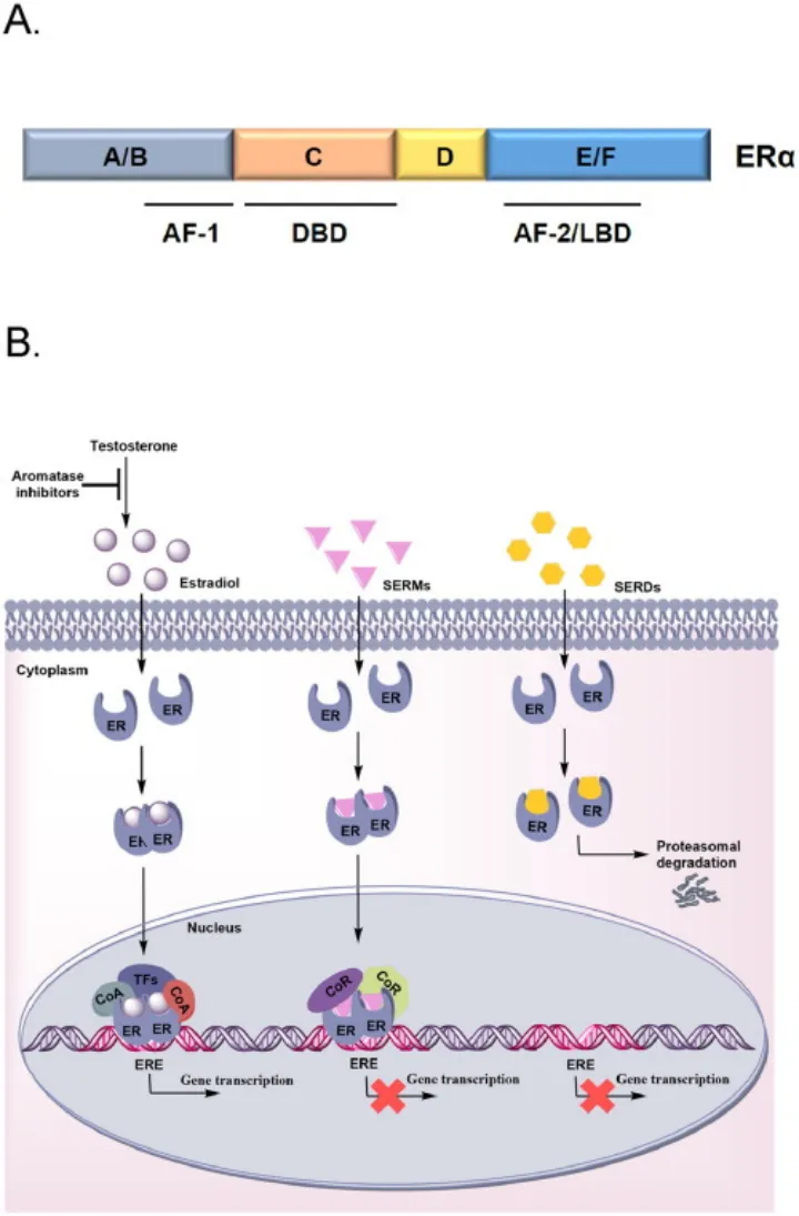 在乳腺癌的分型当中,一个很重要的分型依据是雌激素受体(ER)的表达量,雌激素受体阳性(ER+)的乳腺癌患者大约占所有乳腺癌患者的70%,因此其实很幸运的是,大部分乳腺癌患者都可以接受雌激素相关的疗法,从而大大延长生命周期。并且相关内分泌疗法的上市非常早,选择性雌激素受体调节剂(SERM)的上市时间可以追溯到1977年,而其first in class他莫昔芬的首次合成需要追溯到1962年,一开始是从避孕药的方向进行研发的,但没有成功,后来才发现它在治疗乳腺癌上的优异疗效,算是开创了内分泌疗法治疗乳腺癌的时代。