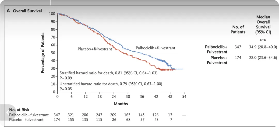 而在之后的生存率统计显示,哌柏西利联合氟维司群组的中位总生存期为34.9个月,安慰剂联合氟维司群组的中位总生存期为28.0个月。