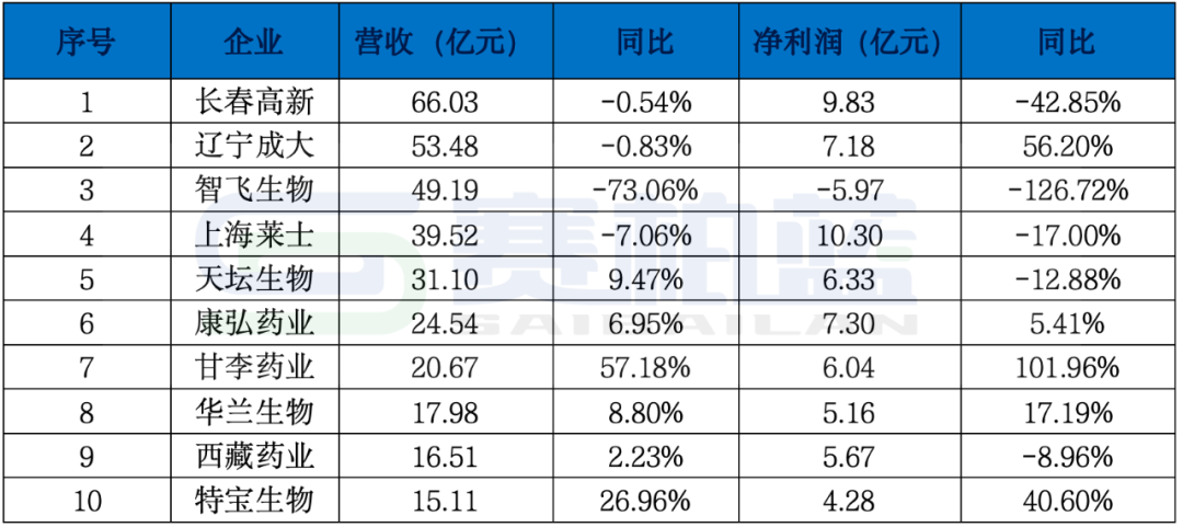 在净利润增长的企业中,甘李药业同比增长1倍,净利润达6亿元,辽宁成大净利润超7亿元,同比增长超过56%。此外,特宝生物由于新品上市进入快速增长期,营收和利润均实现较大幅度增长。