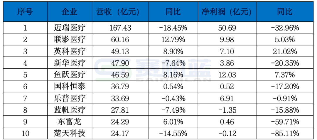 迈瑞医疗仍处于行业领先地位,营收规模超过167亿元,尽管同比下滑18.45%,仍远高于其他企业。联影医疗位列第二,营收突破60亿元,同比增长约2%;英科医疗排名第三,营收接近50亿元,同比增长近9%。