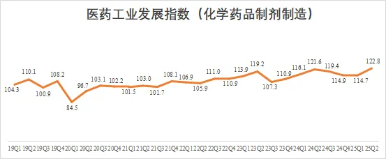 2025Q2化学药品制剂制造子行业发展指数为122.8,同比增长1.0%,环比增长7.0%。板块运行稳中向好,创新转型成果持续显现,营收与盈利能力在行业政策及市场环境影响下实现稳步回升。