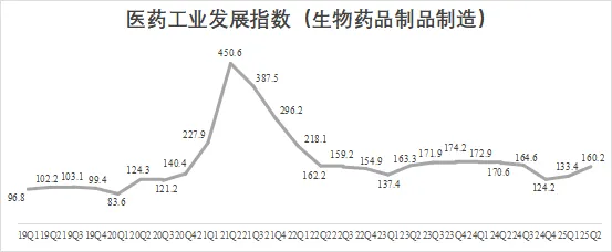 2025Q2生物药品制品制造子行业发展指数为160.2,环比增长20.1%,同比下降6.1%,行业景气度回升。