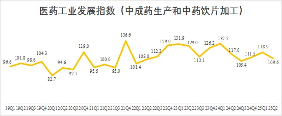 2025Q2中成药生产和中药饮片加工子行业发展指数为109.6,环比下降7.8%,同比下降6.4%。