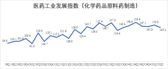 2025Q2化学药品原料药制造子行业发展指数为143.2,同比下降10.1%,环比下降5.0%。