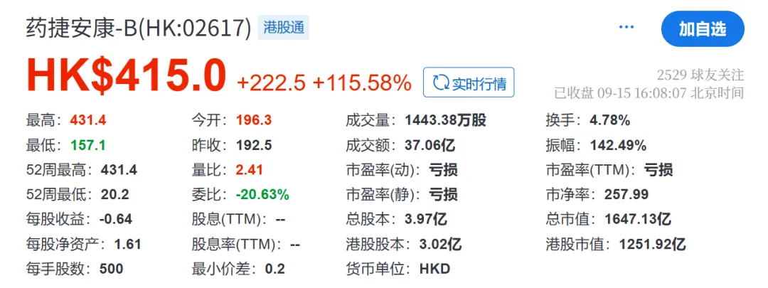 截止2025年9月15日收盘,药捷安康-B的港股股价一度飙升至431.4元/股,单日上涨约110%,总市值攀升至1605.05亿港元。据雪球网披露,自9月10日药捷安康发布积极消息以来,在短短三个交易日内,市值增长已超过1200亿港元。