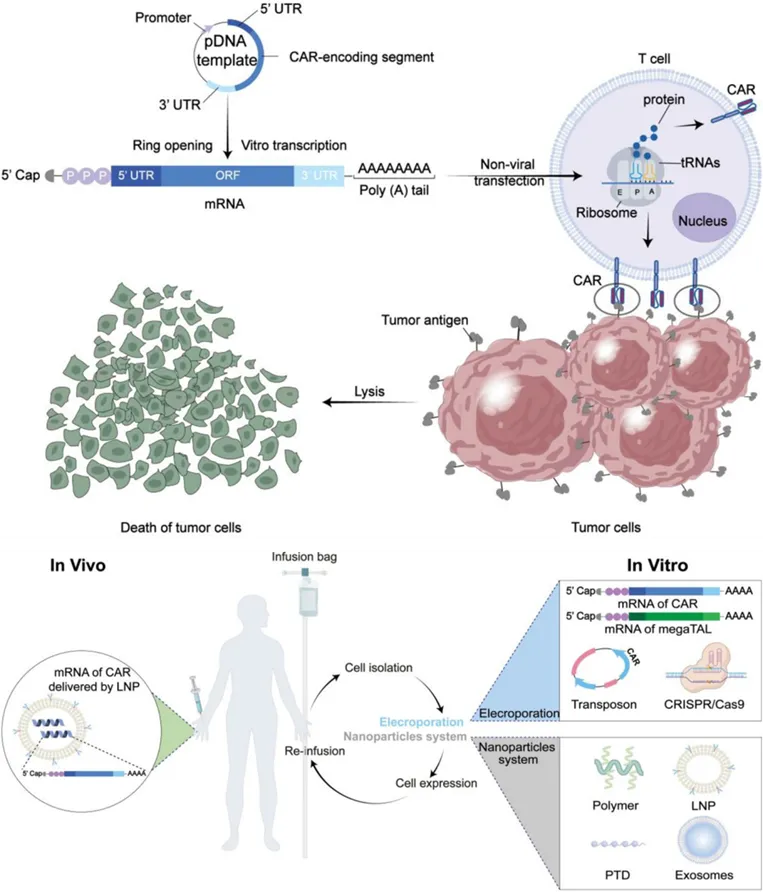 ▲ 基于 mRNA 的 CAR-T 免疫疗法的原理及非病毒 CAR-T 细胞的产生