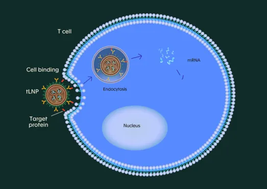 2022 年,CAR-T 之父 Carl June、Drew Weissman 和 Jonathan Epstein 等共同创立了 Capstan Therapeutics,进一步优化了 LNP 表面修饰策略,开发了 tLNP(靶向 LNP)用于 in vivo CAR-T 细胞疗法。其 tLNP 递送系统通过与抗体或抗体片段偶联,实现对特定细胞类型的靶向递送。紧接着,Capstan 将 tLNP 技术应用于其核心管线,在临床前研究中展现出显著效果。