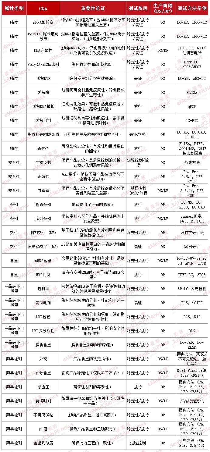 2023 年, BioPhorum 联盟发布 mRNA-LNP 产品的行业共识,为其开发与生产提供 CQA 指导。下表汇总了核心 CQA 内容,供大家参考。