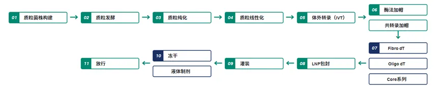 尽管 CQA 标准已清晰,但当前生产工艺仍存在产量低、质量波动大等问题,难以满足 in vivo CAR-T 疗法的商业化需求——mRNA 完整性控制依旧存在困难,与此同时难以精准控制 LNP 的包封率、粒径为之后 tLNP 的偶联制备增加挑战。为满足 mRNA-LNP 工艺开发与生产的 CQA 要求,Cytiva Fast Trak 推出针对性的平台化工艺解决方案,提供了从质粒 DNA 生产、IVT 反应、mRNA 纯化到 LNP 包封、纯化的端到端工艺解决方案。