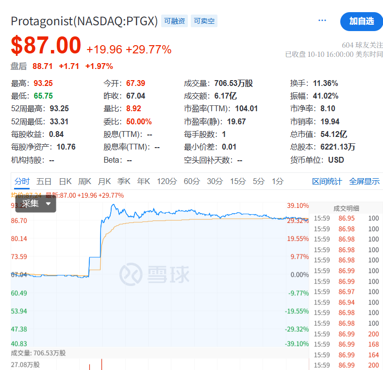 受此消息的影响,Protagonist美股盘中大涨近30%,截至收盘,每股87美元,最新市值54亿美元。