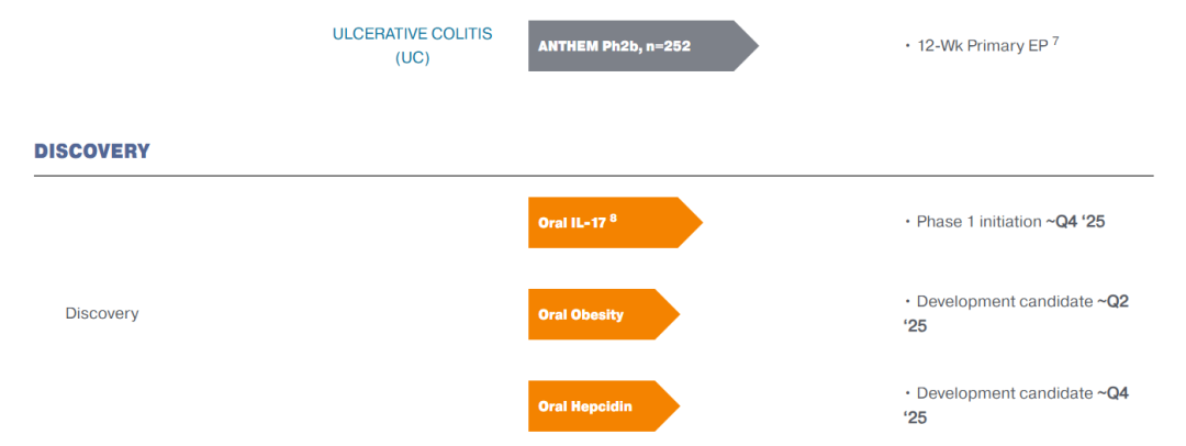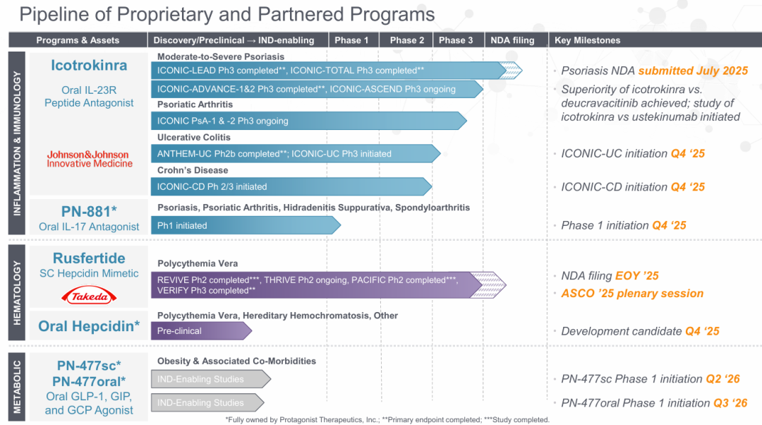 除了这两个项目外,Protagonist还有一种处于早期开发阶段的口服IL-17药物、一个临床前口服铁调素项目和两个临床前GLP-1候选药物。