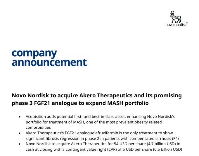 10月9日,诺和诺德宣布已与Akero Therapeutics达成最终协议,将以每股54美元的现金价格(总价值47亿美元)收购后者普通股的所有流通股。此外,Akero Therapeutics股东将获得不可转让的或有价值权(CVR)。在美国监管部门批准EFX用于治疗MASH引起的代偿性肝硬化后,持有人有权获得每股6美元的现金额外支付(总价值5亿美元)。