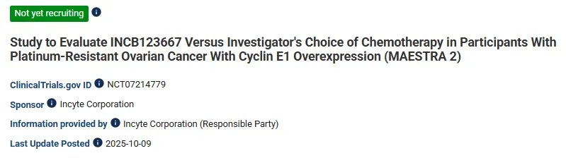 10月9日,全球临床试验收录网站显示,Incyte启动了CDK2抑制剂INCB123667的首个III期临床试验(MAESTRA 2)。该药物是首个进入III期阶段的CDK2抑制剂。