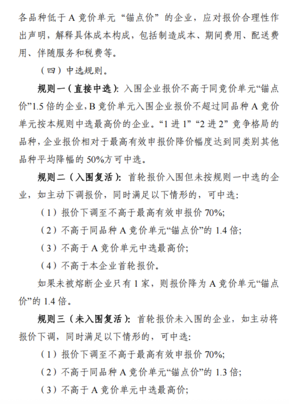 此外,“锚点价”还有一个“低价警示牌”的作用。文件指出,各品种低于A竞价单元“锚点价”的企业,应对报价合理性作出声明,解释具体成本构成,包括制造成本、期间费用、配送费用、伴随服务和税费等。