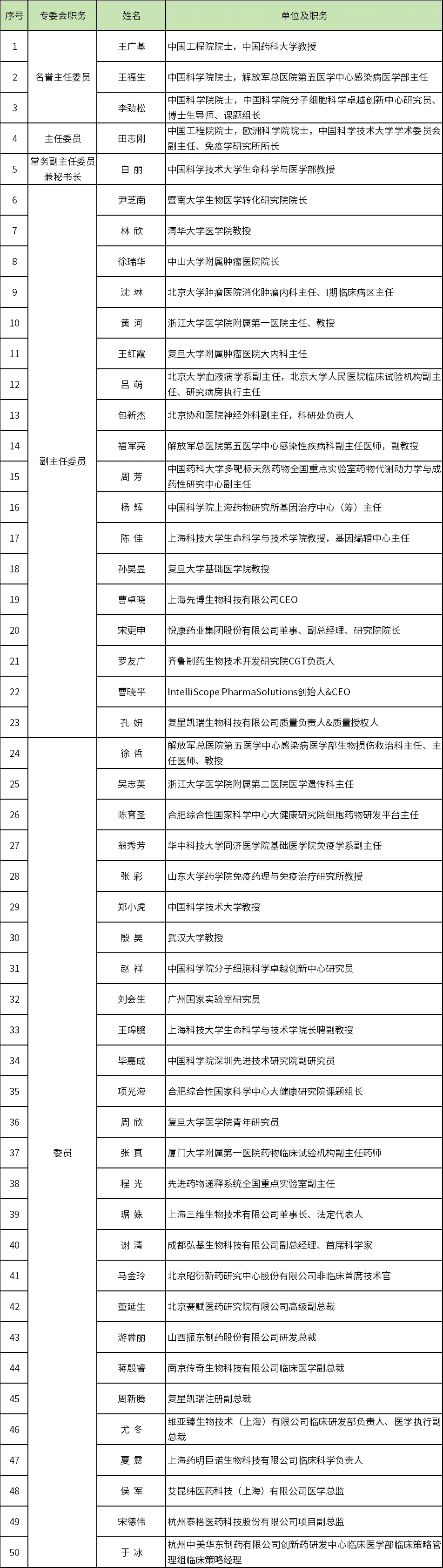 会议审议通过了CGT专委会第一届委员名单(附后),并推举中国工程院院士、中国药科大学教授王广基,中国科学院院士、解放军总医院第五医学中心感染病医学部主任王福生,中国科学院院士、中国科学院分子细胞科学卓越创新中心研究员李劲松担任名誉主任委员;选举中国工程院院士、中国科学技术大学免疫学研究所所长田志刚担任第一届主任委员。