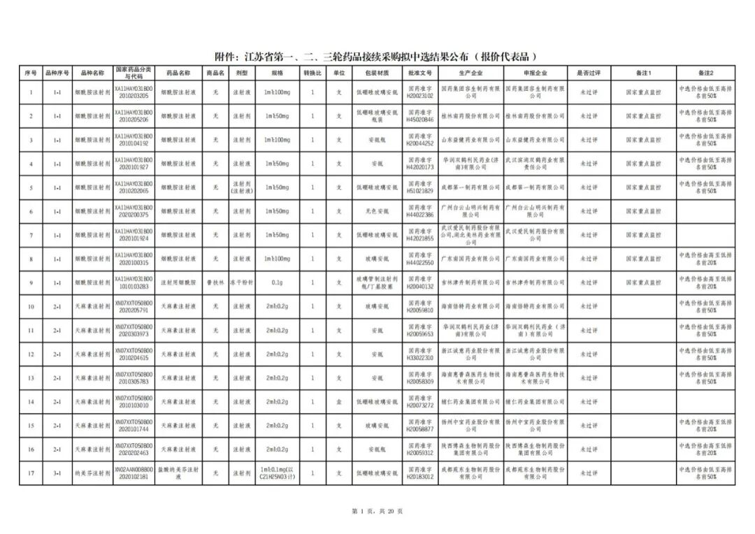 江苏省第一、二、三轮药品接续采购拟中选结果