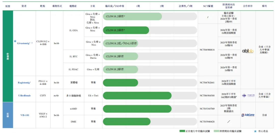 除givastomig外,截至最后实际可行日期,新桥生物已建立包含三个临床阶段项目的管线,包括两个肿瘤项目uliledlimab及ragistomig,以及眼科项目VIS-101。
