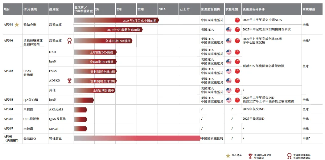 礼邦制药核心产品AP301是一款潜在BIC的磷酸盐结合剂,用于治疗高磷血症。高磷血症是慢性肾脏病(CKD)最常见的并发症之一,存在大量未被满足的医疗需求。AP301已完成中国III期注册临床试验,预计于近期提交新药申请(NDA),目前正在美国和中国开展全球III期关键多中心临床试验(MRCT)。