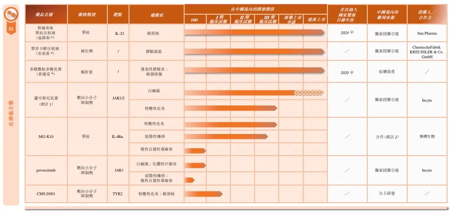 在皮肤处方药领域,其主要产品管线包括三款已上市产品、四款处于临床阶段或后期阶段的候选产品及约五款临床前候选产品。