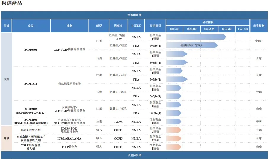 其代谢疾病管线以两款领先的创新候选药物为核心:BGM0504(GLP-1/GIP双靶点激动剂)及BGM1812(长效胰淀素类似物)。