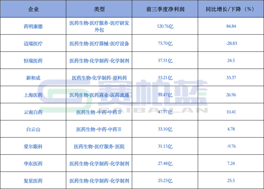 A股497家已经公布前三季度净利润的药企中,净利润TOP10的名单依次为药明康德、迈瑞医疗、恒瑞医药、新和成、上海医药、云南白药、白云山、爱尔眼科、华东医药、复星医药。