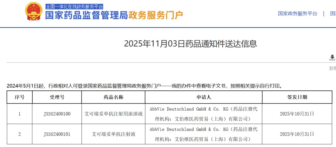 2025年11月3日,据国家药品监督管理局(NMPA)官网显示,艾伯维的艾可瑞妥单抗注射用浓溶液(受理号JXSS2400100)和艾可瑞妥单抗注射液(受理号JXSS2400101)出现在药品通知件送达信息中,这意味着该产品的上市申请审批未通过,原因不详。