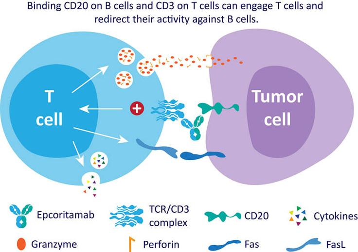 艾可瑞妥单抗(Epcoritamab)是一款CD20×CD3双抗,可同时与T细胞上的CD3和B细胞上的CD20结合,并诱发T细胞介导的淋巴瘤B细胞杀伤。该药物最初由Genmab公司利用DuoBody技术平台开发。2020年6月,艾伯维与Genmab达成39亿美元合作协议,联合开发包括Epcoritamab在内的三种下一代双抗产品,双方共同负责日本和美国的商业化责任,而艾伯维负责进一步的全球化开发。