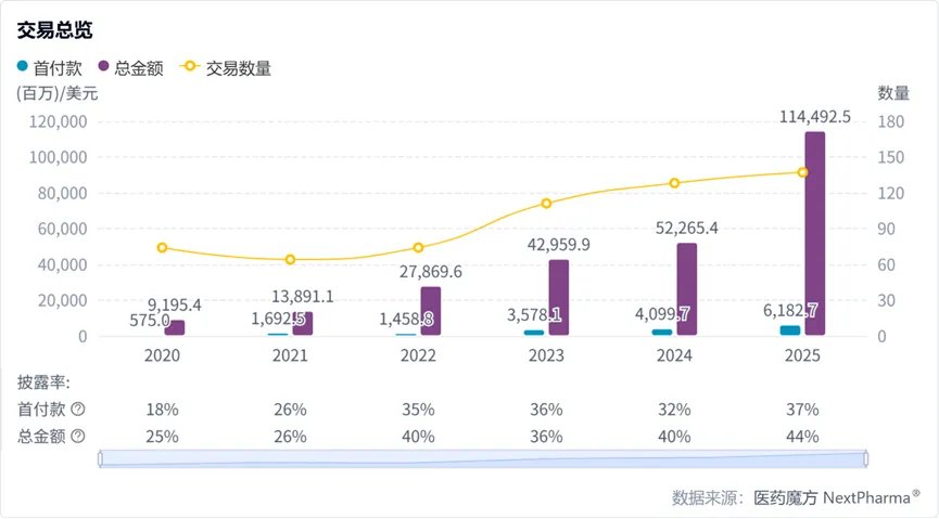 曾经被视为“追随者”的中国企业,如今正在重塑全球医药创新的版图——2025年我国在研药物数量占全球比例已经超过30%[1],仅次于美国。更值得关注的是,国产创新药license out交易量已占全球总数的38%[2],对外授权总金额更是突破了千亿美元,占到全球总交易额一半[3]。越来越多的海外药企,开始主动成为中国创新药公司的合作伙伴。