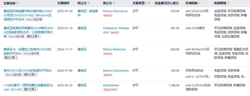 而在这股浪潮中,一些企业开始脱颖而出,康诺亚便是其中的典型。截至2025年,康诺亚已与多家海外药企达成10笔项目许可交易,总交易额接近30亿美元——以国际合作能力持续验证其平台的体系化创新能力。