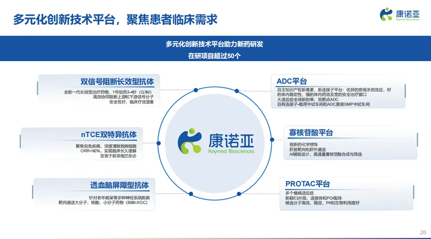 从最初的单一抗体产品起步,到如今构建起覆盖抗体、双抗、ADC、寡核苷酸药物、PROTAC和透脑递送的多元化技术平台,康诺亚清晰地展现了平台化创新的能力。